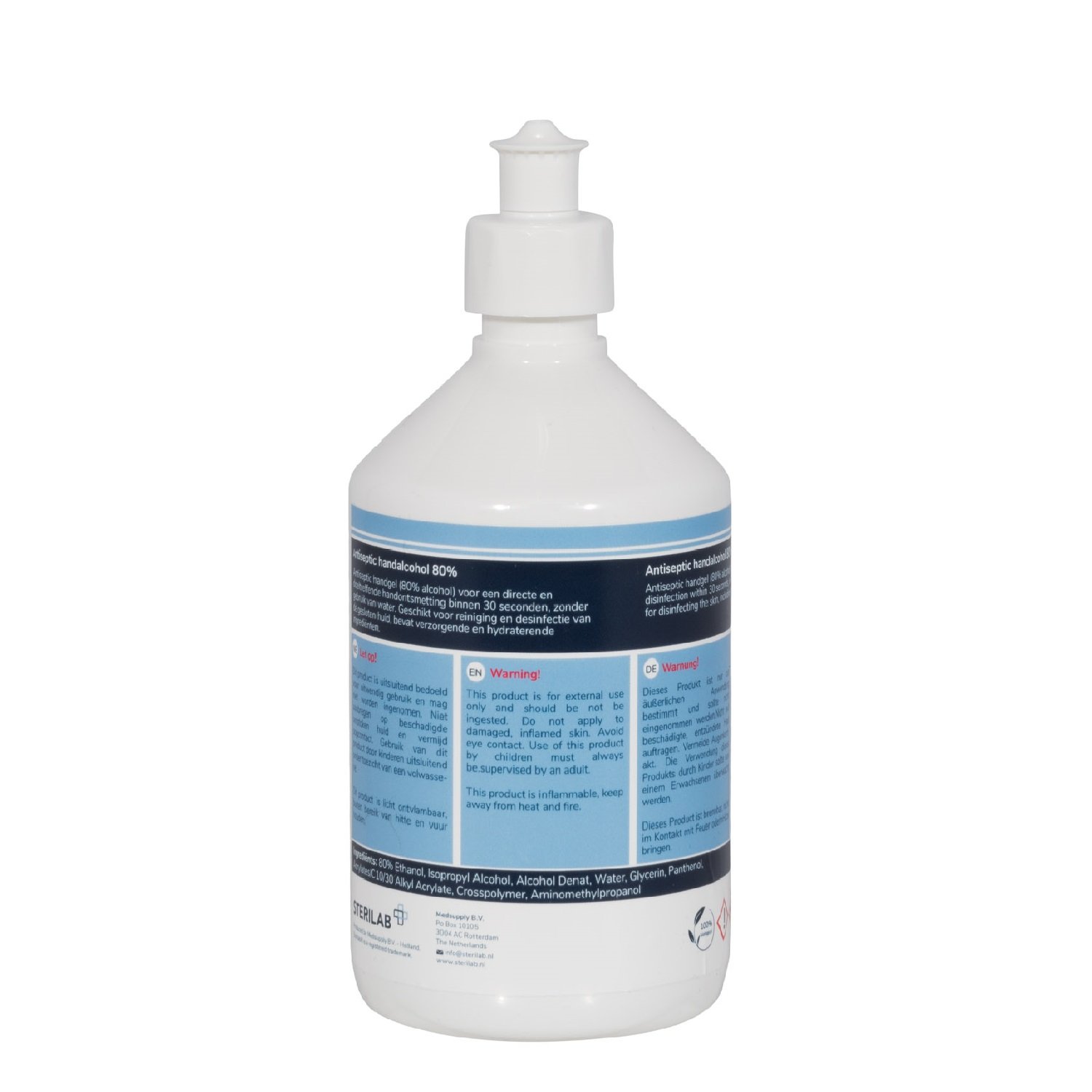 Desinfecterende handgel 80% alcohol voor een directe en doeltreffende ontsmetting binnen 30 seconde zonder gebruik van water.